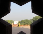 View from the Agra Fort with the Taj Mahal barely visible through the smog.
