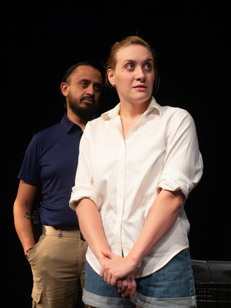 The agents, still acting as friends, offer her “the opportunity to tell the truth,” and an ominous beat, like the beeping in an ICU or the slow menace of low war drums, thrums. Every time the actual transcript was redacted (brilliantly referenced on the playbill and poster), a blue light glares and the beat intensifies, as if, by proxy, the audience is subjected to psychological torture.